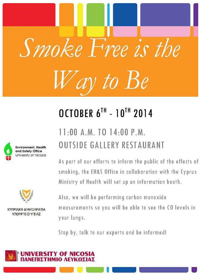 Акция по борьбе с курением в Университете НикосииС 6 по 10 октября 2014 года в Университете Никосии пройдет акция по борьбе с курением "Smoke Free is the Way to Be", организованная при содействии Министерства здравоохранения Кипра. С 11.00 до 14.00 в наружной галерее студенческого ресторана будут размещены киоски с материалами о вреде курения, рядом с которыми будут находиться эксперты. Все желающие смогут получить информацию о влиянии курения на организм человека и окружающую среду, а также измерить уровень оксида углерода в своих лёгких. Подробная информация о событии: