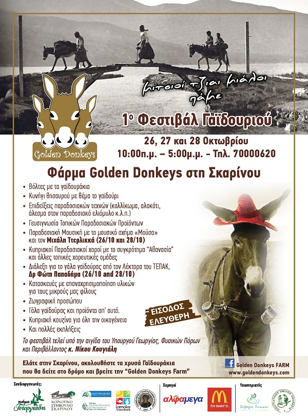 Первый фестиваль осликов в деревне СкаринуС 26 по 28 октября 2014 года в деревне Скарину (округ Ларнака) пройдет Первый фестиваль осликов. В программе праздника: