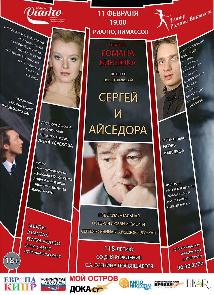 В среду 11 февраля 2015 года в театре Риалто в Лимассоле один из самых известных российских режиссеров Роман Виктюк представит свой спектакль "СЕРГЕЙ И АЙСЕДОРА" (по стихам и биографическим материалам С.Есенина и книге А.Дункан "Моя жизнь").