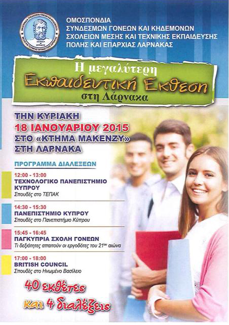 Образовательная ярмарка 2015 в ЛарнакеВ воскресенье 18 января 2015 года в комплексе Ктима Макензи в Ларнаке состоится образовательная ярмарка 2015. Будущие студенты смогут выбрать подходящий университет для обучения на Кипре или в других странах из более чем 40 учебных заведений, представленных на ярмарке. С лекциями для абитуриентов выступят представители Университета Кипра, Кипрского технологического университета и Британского Совета. Время проведения ярмарки с 10.00 до 18.00 Подробная информация о мероприятии: