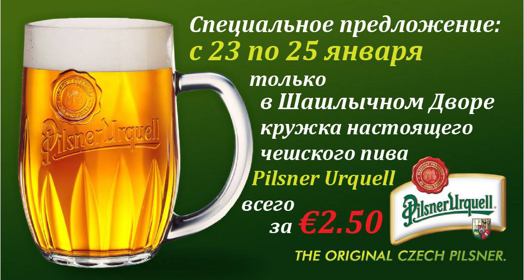 Праздник чешского пива Pilsner Urquell в ресторане "Шашлычный Двор" в ЛимассолеВ пятницу, субботу и воскресенье 23, 24 и 25 января 2015 года в ресторане "Шашлычный Двор" в Лимассоле состоится праздник чешского пива Pilsner Urquell. Кружка пива всего 2,5 евро! Специальные закуски к пиву! Amathus Avenue (рядом с автобусной остановкой Grand Resort),